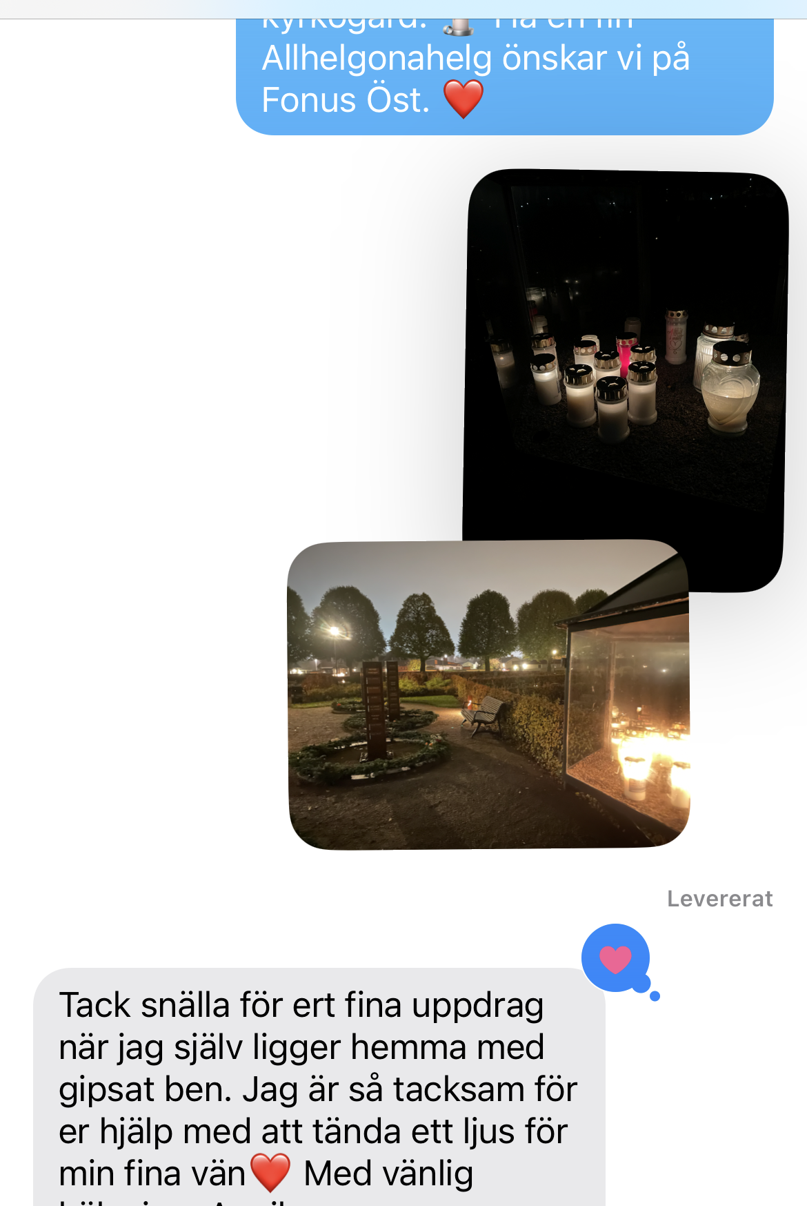 För många är Allahelgona en helg då vi samlas för att minnas och hedra våra nära och kära som inte längre är med oss. För en del är det också en tid att tända ljus på gravarna för att skapa en känsla av närvaro och tröst. Men inte alla har möjligheten att göra detta själva. Därför hjälper Fonus till att föra ljuset till de minnesplatser dit inte alla når.